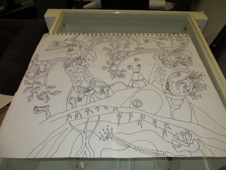 Why talk of hemorrhage? Sigh. Perimenopause. So tired of it. Girlchild says to stop googling stuff…but that’s how I learned to spell hemorrhage! I’ve got another drawing in the head…and it ain’t pretty…which reminds me of a conversation I had tonight with another quilt artist who said that she likes my work, but there’s always something in it that disturbs her (in the case of the piece she was looking at, it was the snake…and there are often snakes in my work. Snakes bad. Christmas lights good.). I had a bunch of people ask me tonight about particular symbols, about what they meant. Hell. I draw. Sometimes I draw something that has a particular meaning. Sometimes I don’t remember that particular meaning 4 years later. Sometimes I just have a feeling, a sense of bad or good or evil or pain or whatever. But why are the lungs red and green? I don’t know. Contrast? I don’t necessarily think of colors in the same way…well with some I do…I don’t know.
