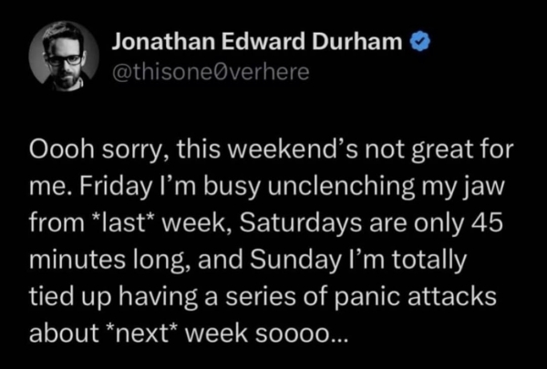 So. Today. I need to pick up meds and find green beans. I have no clue what’s going on with Thanksgiving dinner; not my problem apparently. I am going to ceramics today to work on my frame. I tried (notionally) to get there Thursday, Friday, and Saturday, and failed across the board, so today it is. It’s hard to make myself leave the house on break. I just want to stay in my pajamas and not even go outside…although the weather is quite nice out there. Not too hot, not too cold, a little cloudy. I should do some yardwork honestly. Or not. I should do a lot of things, and that is always the problem with this week off. There are worse problems to have, though, so I’ll stick with this one.