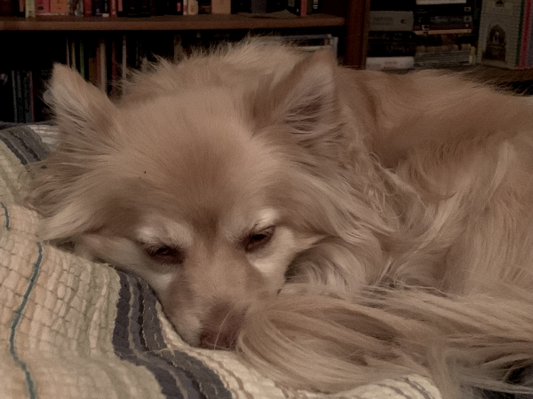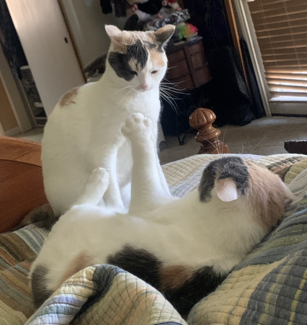 Although this was before the Man came to bed. Luna showed up in the dark. Nova doesn’t come in on the bed any more. She would, but the dog freaks her out. Her loss.