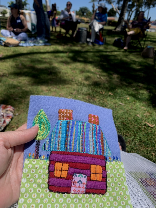 On Saturday, I also went to an actual in-person meeting (outside, in a park, where I got sunburned again in a weird pattern on my back because I thought it was all covered up, but I was stitching and so I was bent over and…duh). It was one of my quilt guilds…and I worked on Sue Spargo’s Homegrown, finishing the third of four blocks for March.