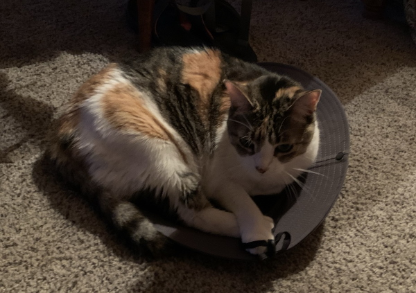 When I got back from the hike, Kitten decided my hat was a sleeping space.