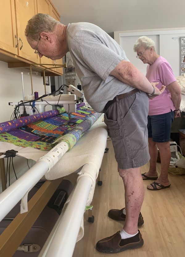 I started this at home and have been trying to write while being at mom’s with the quilting machine. We got to the bottom and have to go back to the top to fill in some wide apart areas we had in the beginning. Not today. Gotta go proofread some stuff, ship one quilt, and deliver another. All good.
