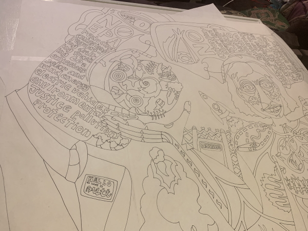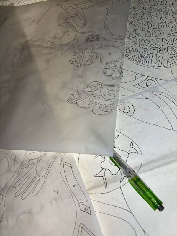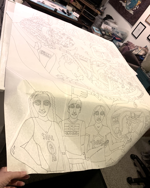 I didn’t realize until the middle of the night while trying to sleep that the heads would be filled with words. And then I tried drawing that bottom left bit about 4 times and finally cut that section out and taped a new piece in. I’ll try the redraw tonight…and then it might be done.