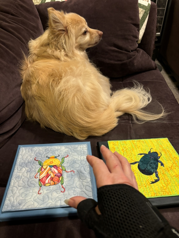 The wrist brace is a thumb thing…from too much tech…mouse plus holding phone and ipad plus IDK what. The embroidery doesn’t seem to bug it…I sewed these down with the brace on.
