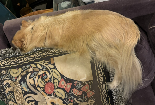 Meanwhile, I don’t have a picture of last night’s skunk, but here’s what I caught Luna eyeballing from inside the house.