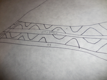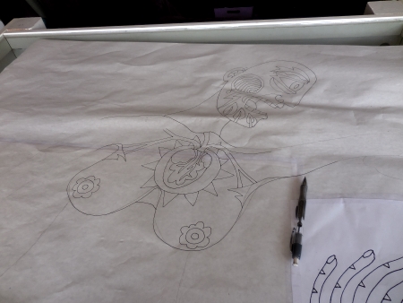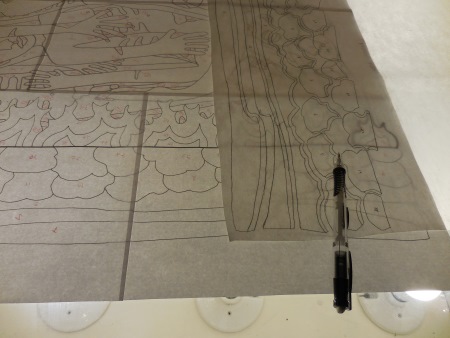 Hung the new drawing where I could see it, assumed the background fabric I had would work, and started the next fabric-picking adventure…