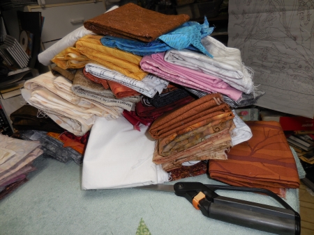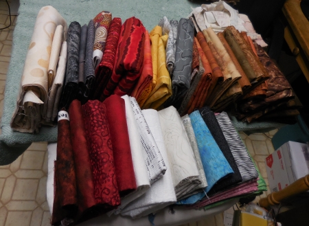 I had a ton of fabric to put away, both from the last quilt and from Houston, so I started by stacking by color, because everything in here is stored by color, except for the ones where I can’t figure out what color it is.
