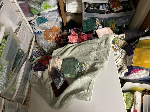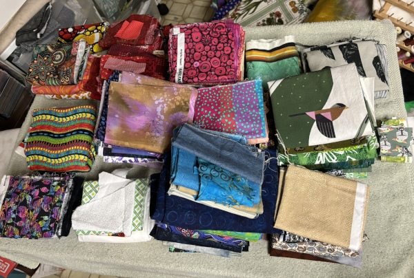 So I’ve been short on art time most nights. I cooked late Wednesday because of pilates and getting all the trash ready for pickup and IDK what else I did. So I finished cleaning up the studio finally and picked the fabric for the background of this one, and laid out the first 100 pieces.
