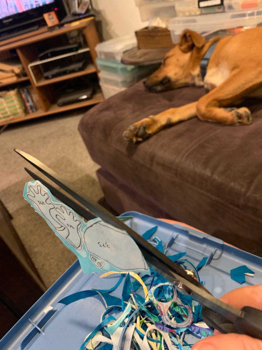 With Kitten for size comparison. That was about an hour of cutting. In total, 5 hours and 22 minutes to cut those out. Tonight, hopefully, I will sort them, and tomorrow, start ironing to fabric. I need to figure out a background fabric. I might need to go buy some tomorrow. Keeping that in mind. Fewer pieces goes faster. Don’t get me wrong, I LOVE the big quilts. The next one will be big, I think. Maybe. Gotta look at deadlines and see if there’s anything that I want to make art about.