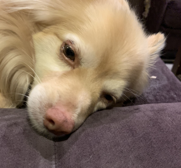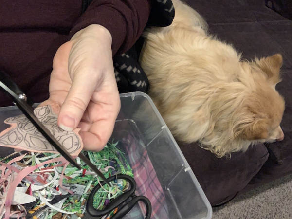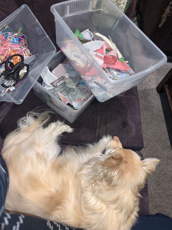 Nova assist. Also precarious position of my NEW school computer. Yes, I moved it. I traced for about 90 minutes, got off the meeting, ate dinner late (second night in a row), worked on school stuff for a bit, and then traced a little more. The pro is that I’m at about piece 350, so 250 to go. Probably not going to get ALL of that done tonight? But it would be cool if I did. The current plan is to go hang out with my stitching guild at the library tomorrow and cut a bunch of these pieces out. I don’t have to be done tracing to do that, but it would be nice if I were.