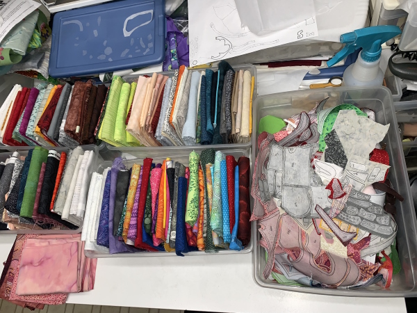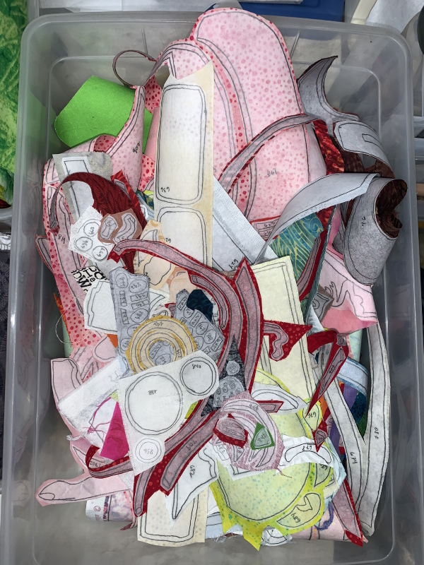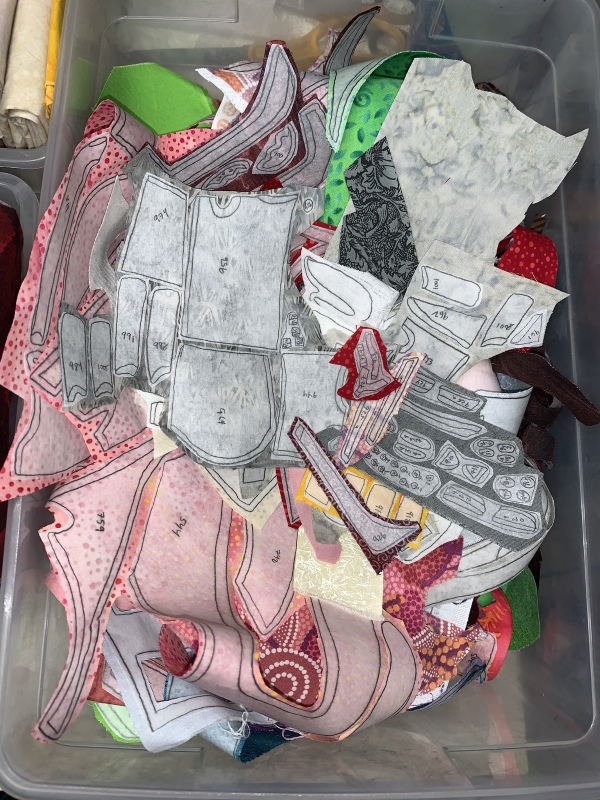 Lots of fabrics. Lots of colors. I keep adding more. I have a little left to do on her head, plus another arm, two birds, and some giant eggs. Then I’m done and can cut things out for a week or three. Hopefully not three. I’d like to finish another smaller one in there somewhere. Probably not happening. It might, though. We’ll see.