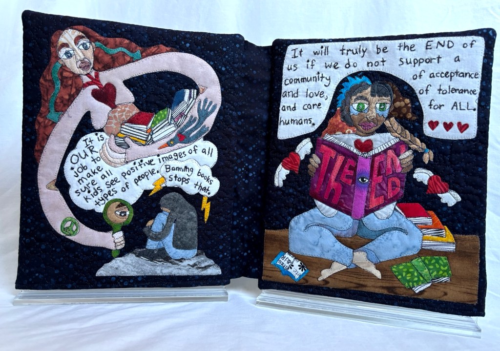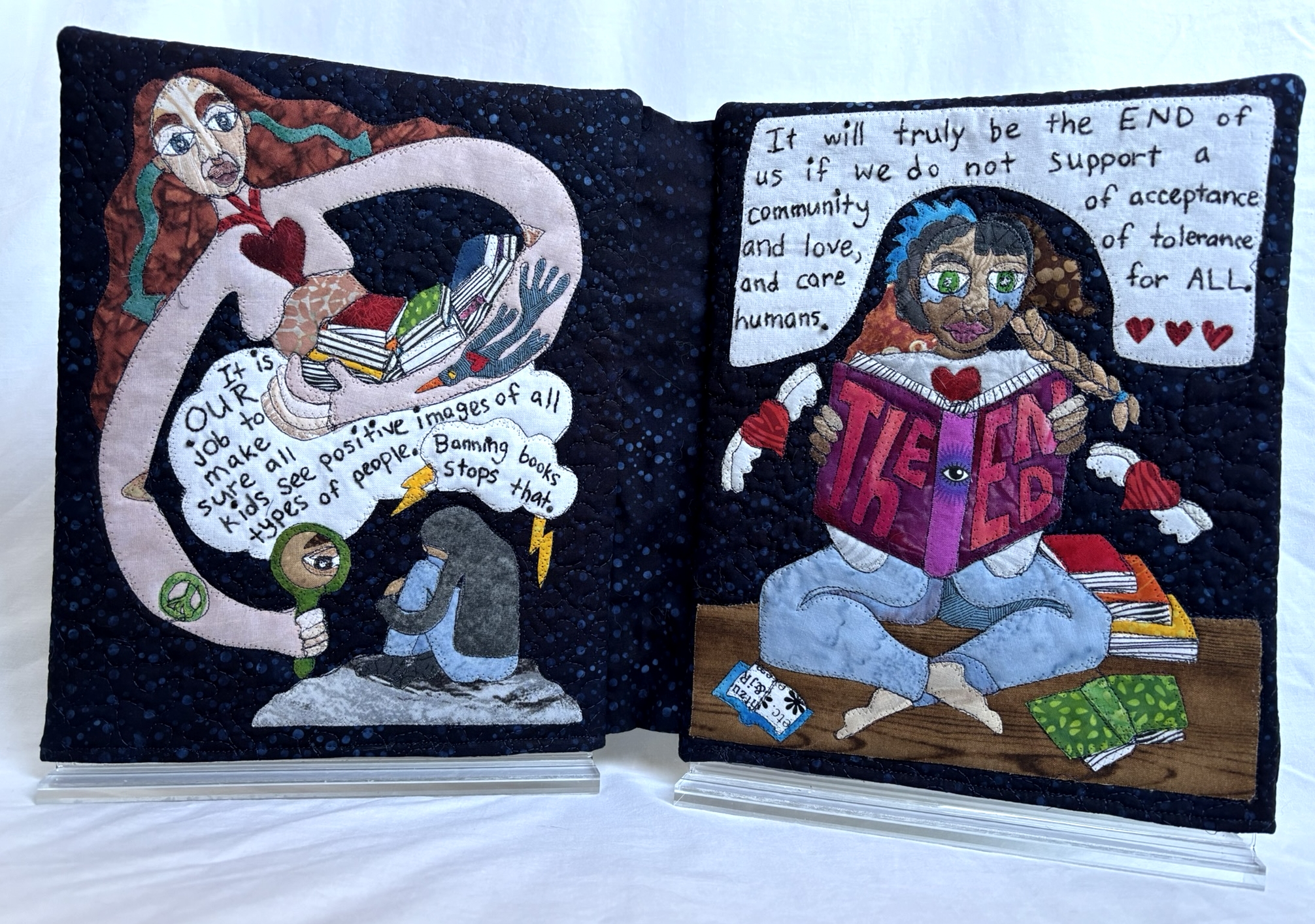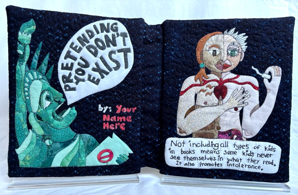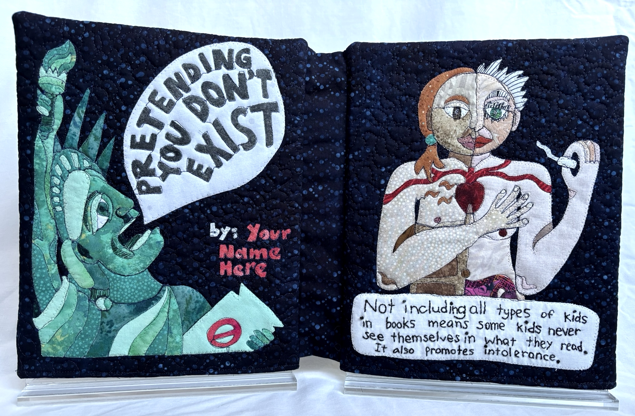 I had started a book for a local show and did all the embroidery while on Spring Break traveling, but did the quilty part of it in late April and early May. This is Pretending You Don’t Exist, which still needs official photos. Here is the front…