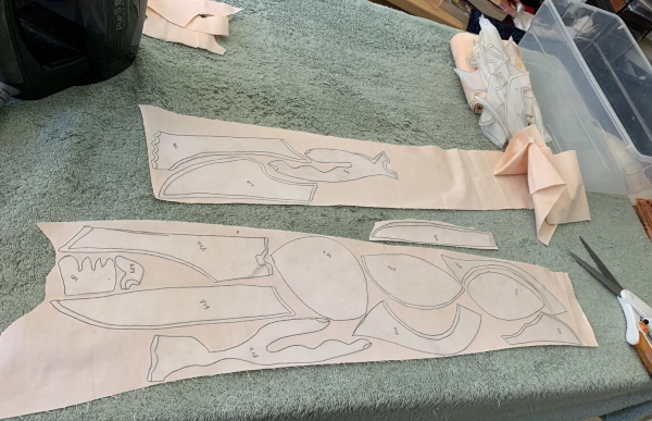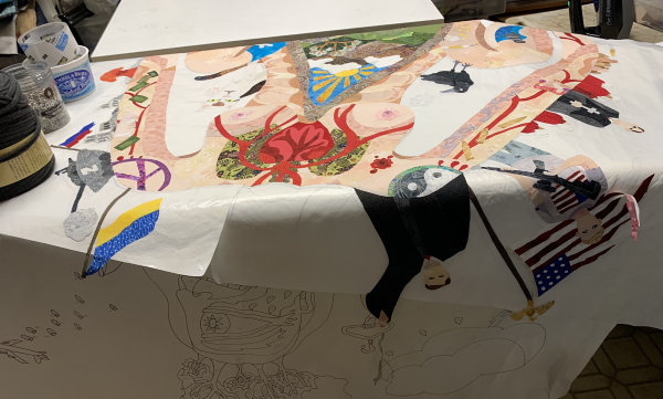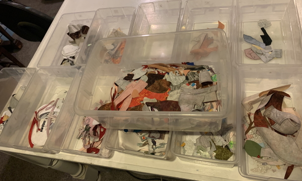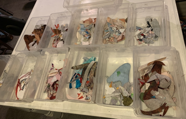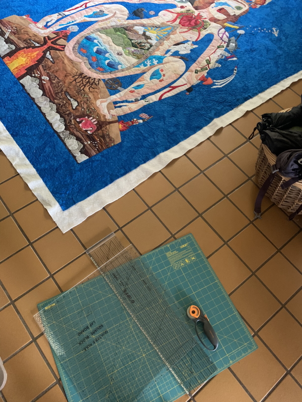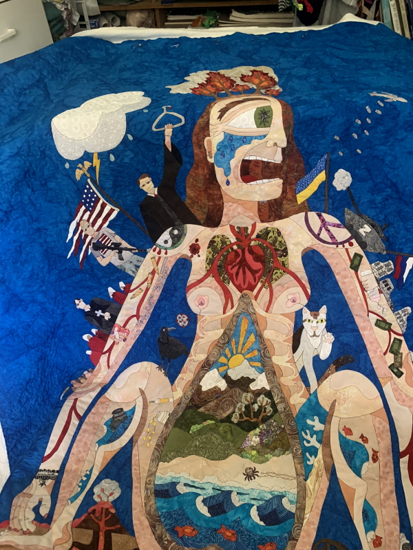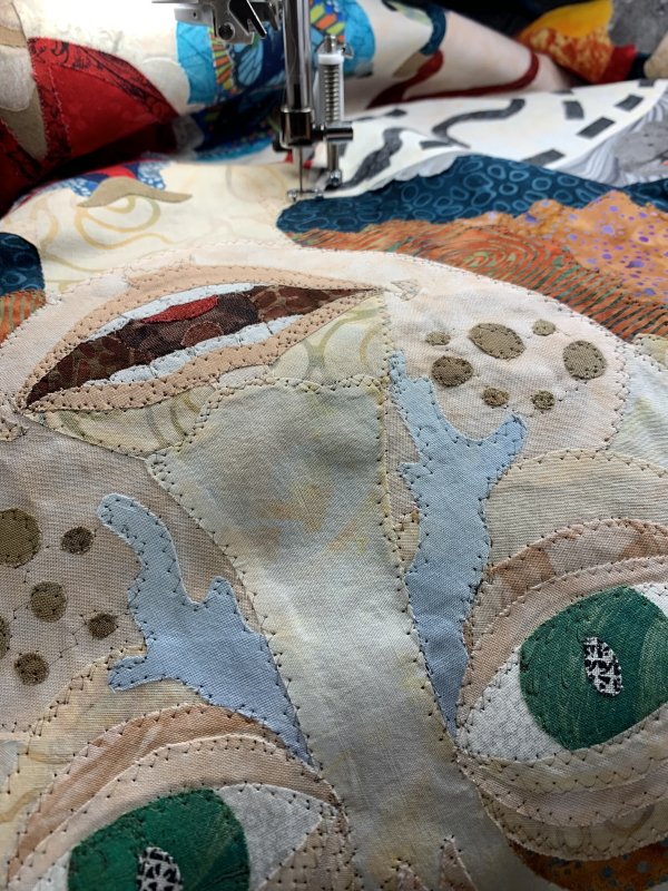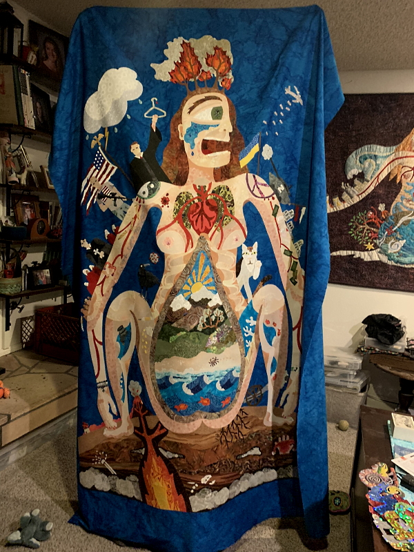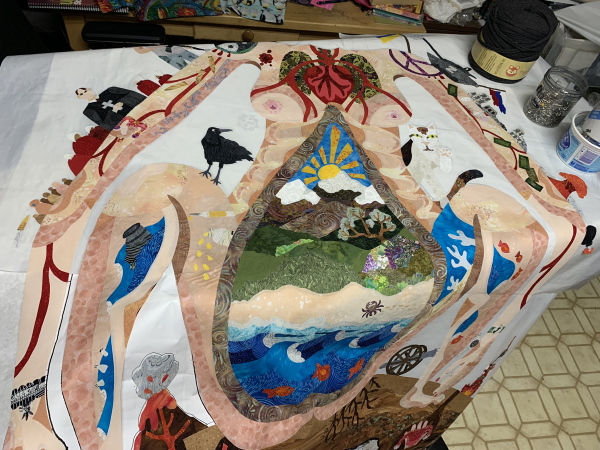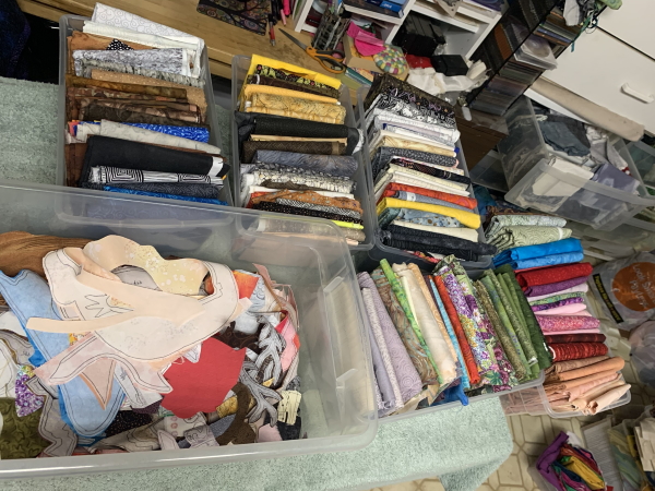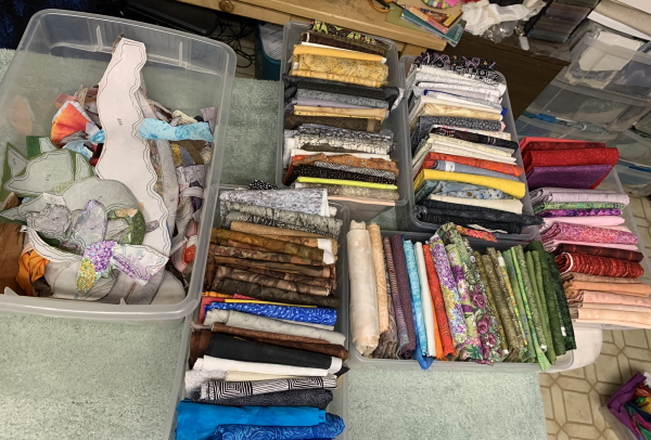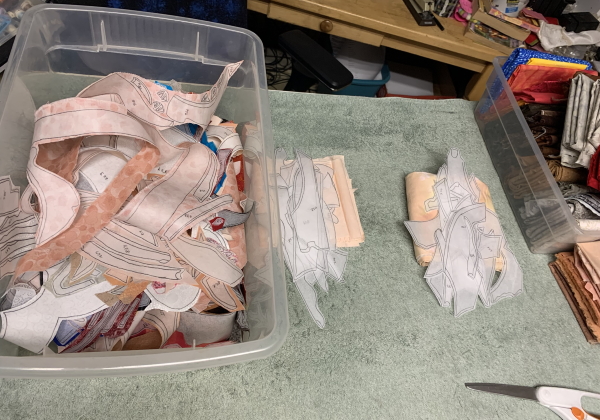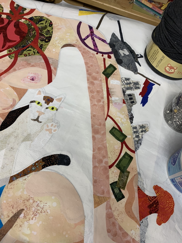 And the cloud parts on the leg, but not all the stuff inside them. I still have stuff in the 300, 400, 700, and 900 boxes that hasn’t been ironed. Plus all the innards where the belly is cut open. I have one intestinal fabric chosen, but the rest is still an unknown. You can see the colors are piling up…the cardiovascular reds. That green/yellow mix is what I picked for the esophagus…I’ll try to repeat some of that down in the digestive system. Reality is not really where I roll. So I’m not halfway done…still. Getting there? Slowly. Tonight will be a challenge…there’s a lot going on. There’s a pottery tour this weekend and I’m hoping to put a couple of ceramic pieces in. We’ll see if that happens.