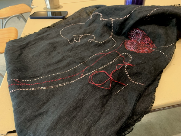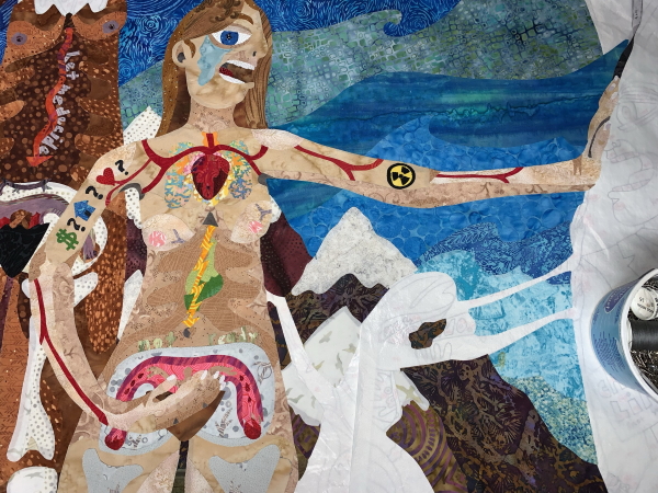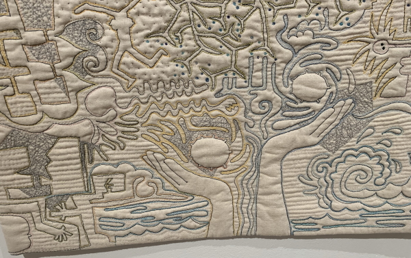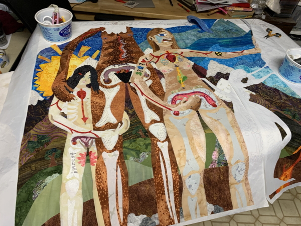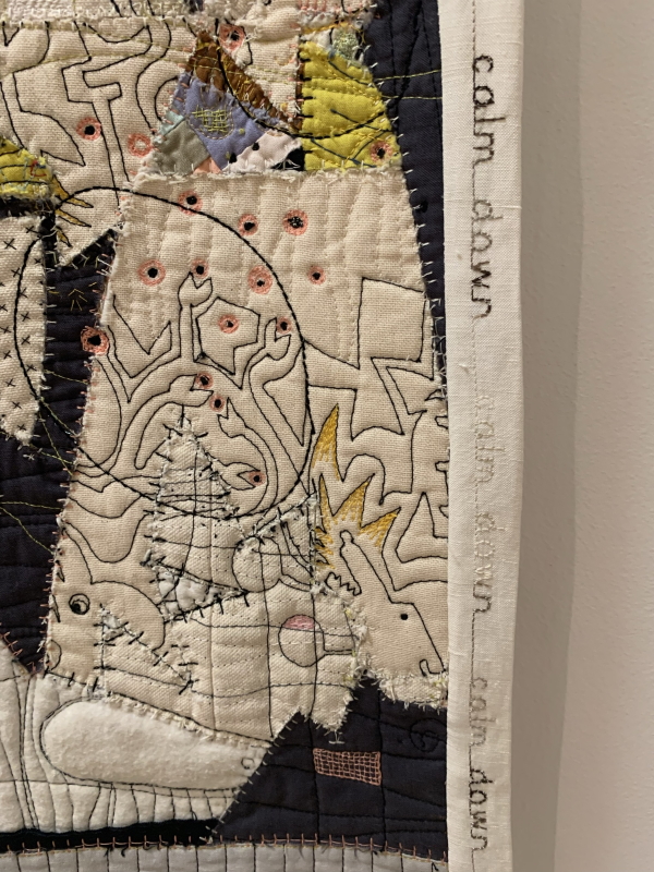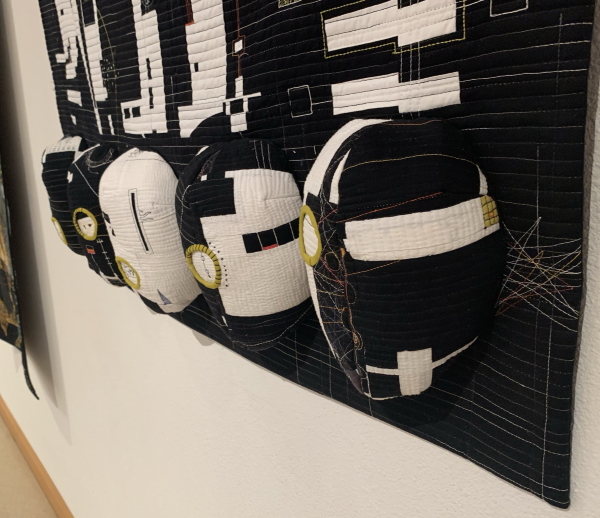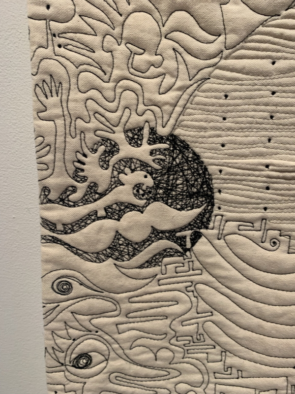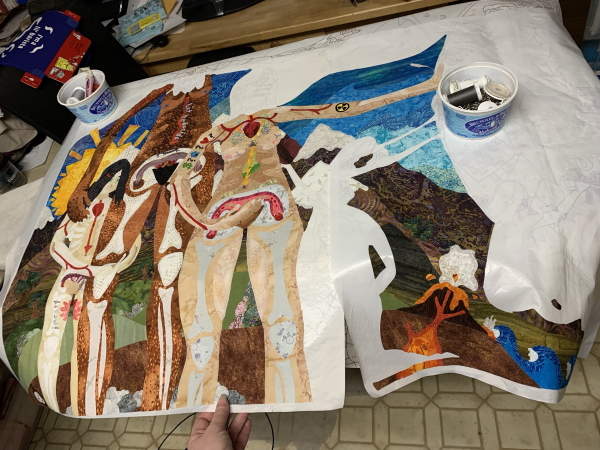 And so many of the details are hard to see in this photo. Part of that is the stitching that needs to happen, but also, honestly, like many of my pieces, you need to be up close to see most of it. So stitch down is next, probably 10-15 hours of that, then sandwich and pinbaste, an hour, then quilt for 15 hours or so, then about 6 hours of binding and sleeves. So 37 more hours? In two weeks? Probably not. Not with holidays and a copyediting job and a bunch of science planning that needs to happen. We’ll see. Plus grades.