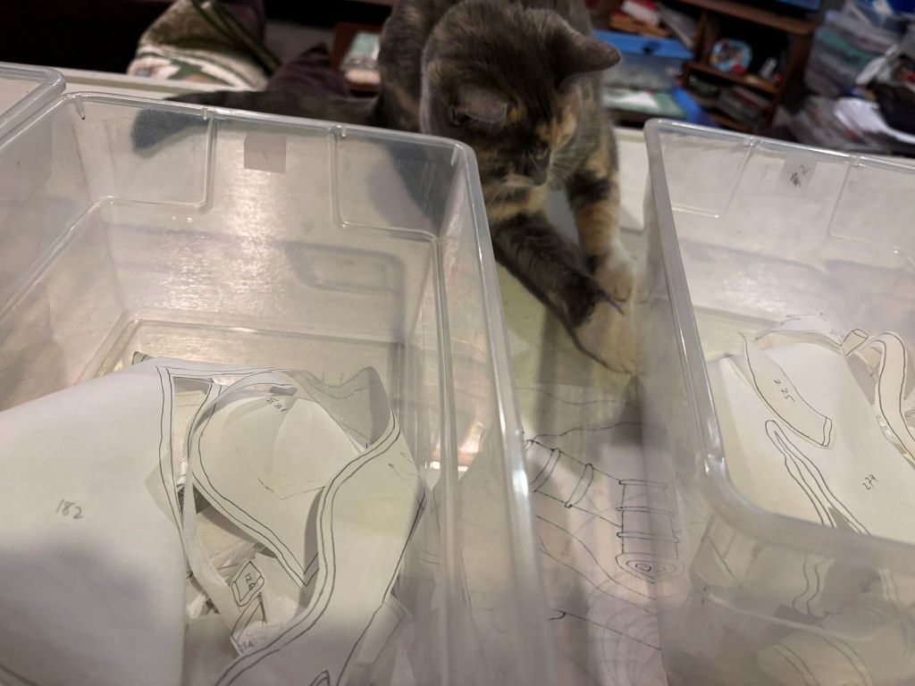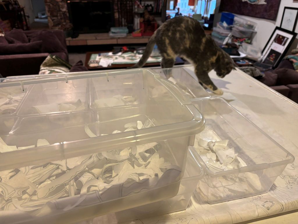 At this point, Scribble was less than helpful…she kept seeing shadows under the bins and shoving them apart to get to them.