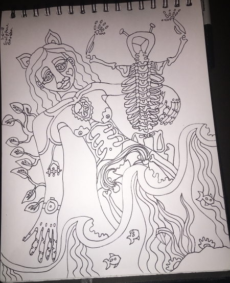 I started working with that skelly back and a front-facing figure, seriously trying to work stuff out, but it quickly devolved into whatever I felt like drawing. Hence the antenna I guess…