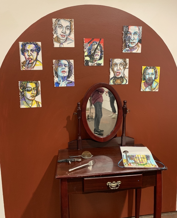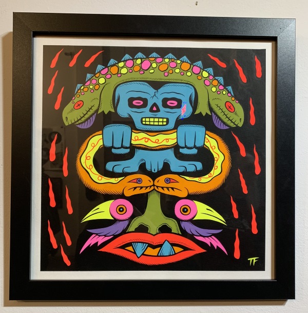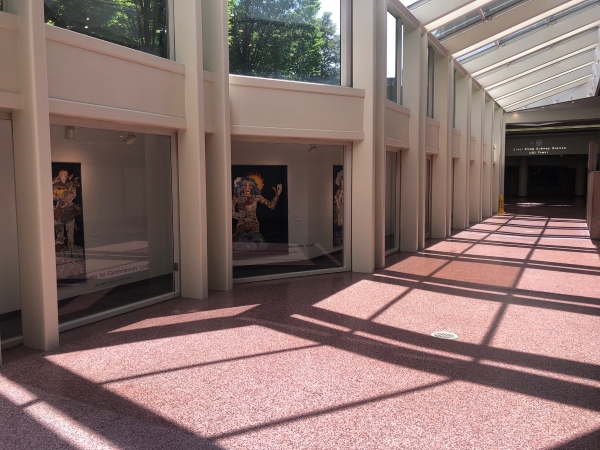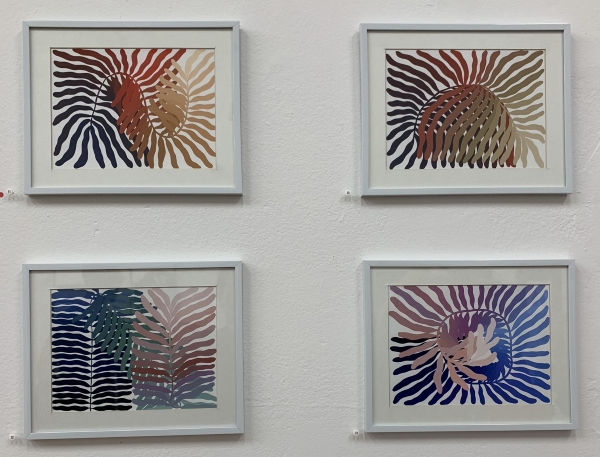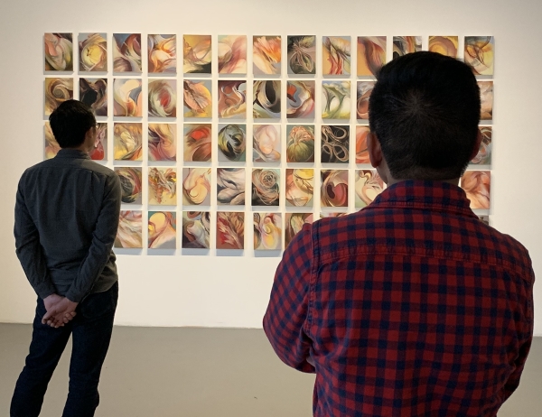 So the opening of Indoor/Outdoor was Saturday night. Here’s my favorite wall…with Asa Kvissberg’s Girl in a Suit I, II, and III, my Bigger in the Outside, Helen Redman’s Monster Mama, Moya Devine’s Summer and Rootbeer and Snake Charmer, and Cindy Zimmerman’s Oklahoma Girl in California World…all the colors and shapes seemed to rock together.