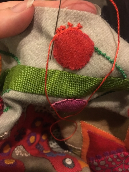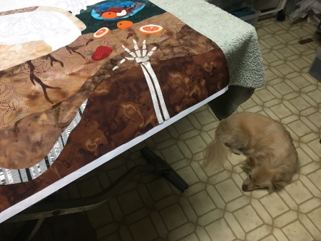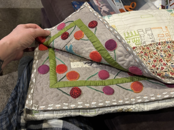 That’s the layout. This is Sue Spargo’s Homegrown, which might have been started in…hell, IDK…wait! OMG. Started March 16, 2020. The day they sent us home for two weeks because of COVID. Little did we know. Oh my. I’m laughing. So this one is just two months’ short of being 5 years old. I did Folk Tales in between the bird one and this one. And there’s another bird one I did too, Chirp…both Folk Tales and Chirp are ready to be sandwiched and quilted, but this one needs to be put together so I can do borders, so it’s a good year out from being finished, if I’m lucky. Anyway, I have a Zoom tonight and I will sew things together and try to figure out how to solve the problem of the center being too small. It’ll be fine.