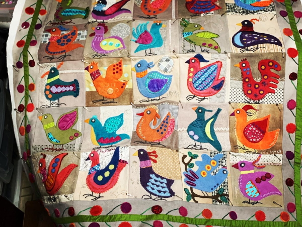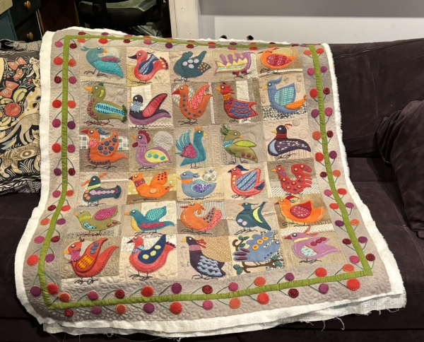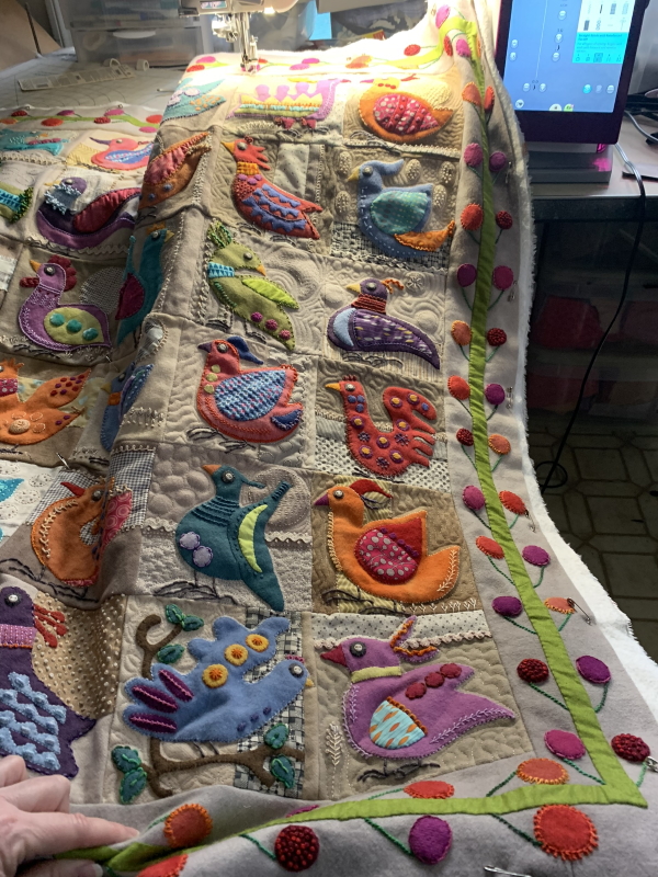 Just need to do the handstitching of the binding and sleeves, and it’s done. Twelve years. Impressive. Can’t say I don’t finish shit. I do eventually. This is Sue Spargo’s Bird Dance, by the way. I called it Bird Crazy for years.