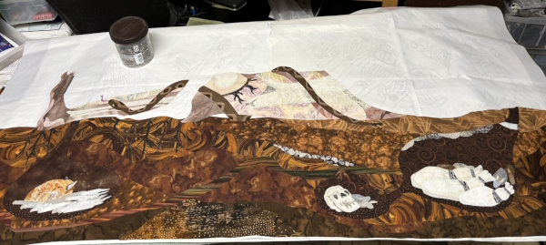 I somehow have lost a week. The year has changed. I have not posted my memories of 2024 nor my goals and hopes for 2025. I missed the boat completely. What happens to me if I do not consider everything that 2024 brought and 2025 might bring? I dunno, but I don’t seem to have the brainpower for it. Although I redid my big long huge CV/resume/whatever the hell it is yesterday and I know that I was in 12 exhibits last year and I made 6 quilts and 10 bug things that aren’t really quilts. I read that an art quilter I follow made over 60 quilts and I can’t fathom that, but probably she’s not working full time as a middle-school teacher. So that’s another reason I have a hard time with the review/gratitude part of the year ending. It makes me feel inadequate until I have some interior brain argument about what people are capable of and that’s why I picked a fucking retirement date last summer. Oh yeah. I remember now. So in 2025, I hope to make another 6 or so quilts and get into another 12 or so shows and keep messing around with clay and trying to keep my day job from inserting itself into my recharge time more than it already does. No change. I actually usually do resolutions in August, right when I’m about to go back to school. It makes more sense as a teacher to think about those things then rather than in the middle of a school year. I am glad I have next week off, because I have to get 6 quilts out of here in the next week or so for delivery to shows. So some of that will happen today.