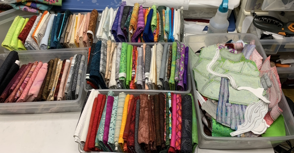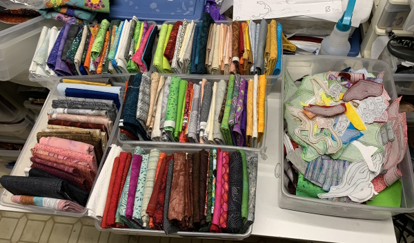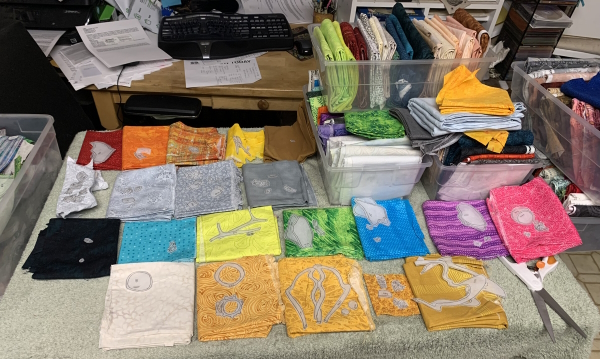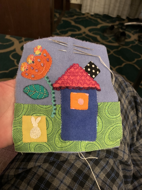 Finally finished the old spool and put the new one on. It breaks again. Aargh. Slowpoking it through the last bit of this. At this rate, not sure when I will finish. I did buy binding fabric Saturday morning…it’s why I didn’t get an earlier start to LA, although I was on the road north at 9:30 AM. Didn’t matter. It was 3+ hours up, an hour up there, then an accident on the way back. Got home at 6:30 PM. Ugh. Blood sugar was a mess the whole time. Fun times.