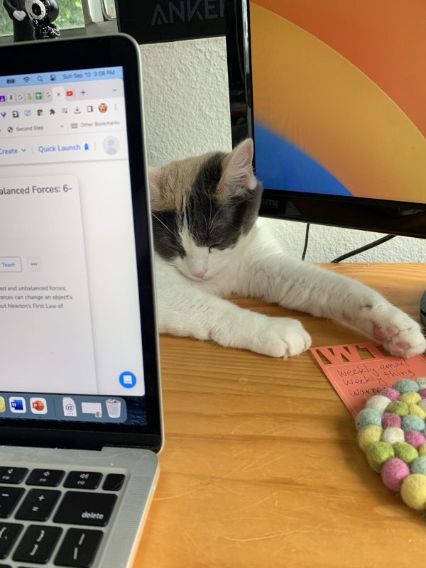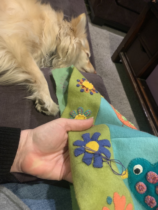 OK. It’s Monday. Another full week. Trying to fit exercise and ceramics in…not sure how that’s gonna go, honestly. Today? I’m teaching forms of energy. Mostly notes…a couple of demos. We built in some independent time this week (we’ll see how independent they really are), so we could NOT be direct teaching (which is exhausting for us and the kids) all week. Also maybe we could grade some stuff at school instead of bringing it all home. We have a two-hour (torture) literacy meeting after school today, ugh, with lesson and all. Not fun. Hopefully useful. They haven’t been, really…just been performative, which is annoying. They did let us plan our own learning this year, individually (although me and my co-teacher are doing the same lessons). For once, we get to decide what our kids need. What a concept. Then home to deal with a broken blind and the guy fixing it, with two dogs in the house. Then book club. And some stuff in and around all that. I think I read the book. I don’t remember. Oh yes! I did. It was nice. Not amazing, but nice. Then more stitchdown! Which is where I really want to be.