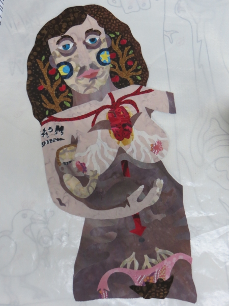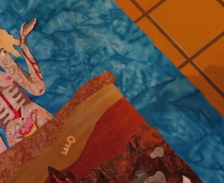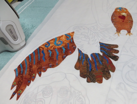 I did it all on the entryway floor (luckily I chose to do this BEFORE we removed the very dead Christmas tree from the house, thus scattering pine needles into corners where they will not reveal themselves until some time in August). I had the whole quilt ironed together in a few large chunks: the earth base, the lower torso of the Crone with the Maiden and the Mother attached, the one bird, the upper torso with arms and staff, and the head and hair entwined with cat and owl. There were also some smaller loose pieces that couldn’t be attached until the whole thing was down on the background fabric.
