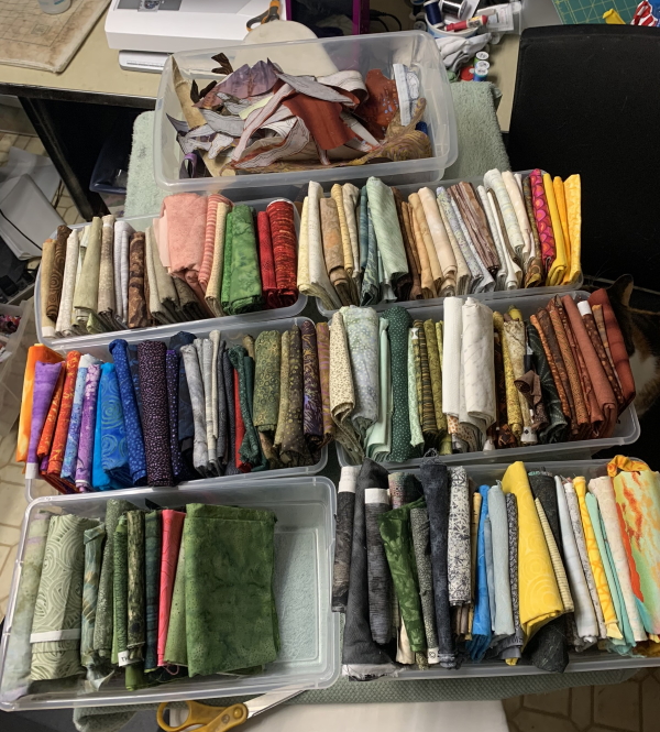 I now have the overlap of Still Ironing Wonder Under to Fabrics with Cutting Out Fabrics. So I will never see the bin full of ALL the fabrics after ironing, but I am being more efficient with my time. All good.