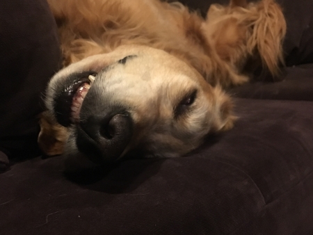 Yesterday, puppy was really tired. He was so happy here…tummy scritches and a fan blowing his fur around. Bliss.