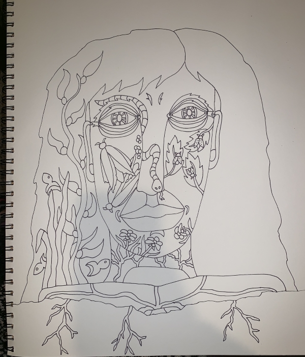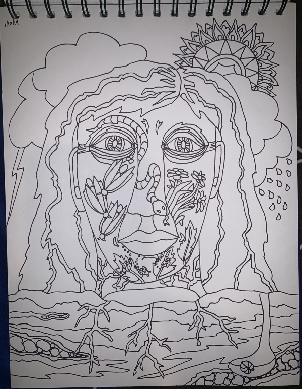I want to fix what’s on the face a bit, and then have her shoulders above the dirt, and do something totally different with her hair and the sky. So really, it would be easier to redraw it larger and then fix it there. But I haven’t been able to get the face right…