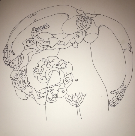 So after grading and dinner and some spacing out last night, I stood and stared at the big blank spaces of the drawing. I thought about what I was trying to say…about what was important and why. And I started sketching some stuff. And because it’s sketching, it’s super light and really hard to see. OK, yeah, like in this picture, you can’t really see anything. But know that I’m filling in this space with a mountain and plants and animals…