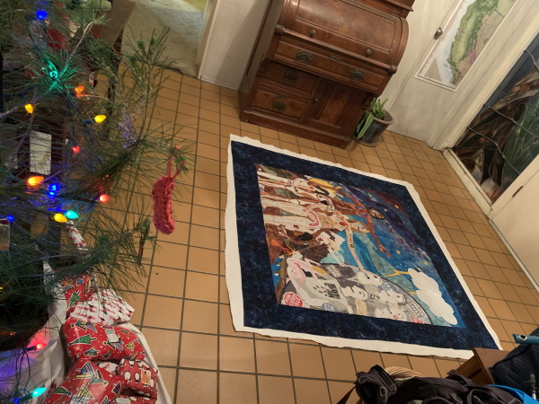 Then last night, after friend Zoom, I cleaned the floors (they were bad), washed the batting, pieced a backing (it was complicated, but I used most of a fabric I had left over…I think there’s like 3″ left of it), and pinbasted the thing.