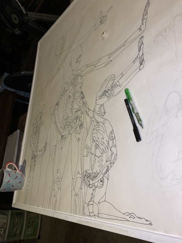 I think I have most of the figures on the left done. I’m trying to refrain from more details. There’s enough. I got myself all tied in knots over shadows last night…drawn shadows. They just got to be too much. So I got rid of a bunch of them.