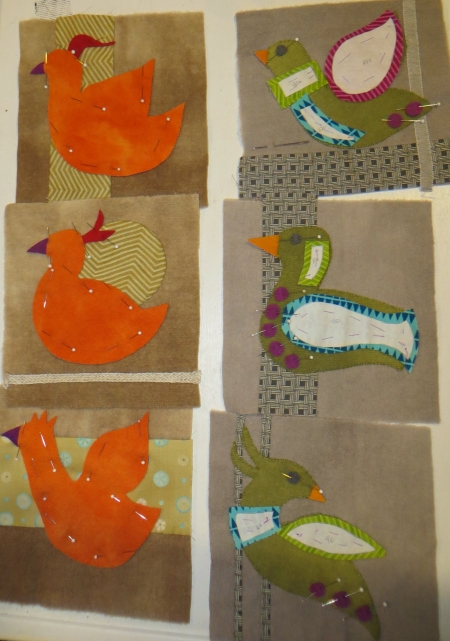 But I did get some done…the backgrounds for the orange birds and getting the green birds sewn down…now they just need all their parts. I have another post to write about the vendors and shopping at IQF and some other stuff…like the apparent milk shortage in Houston.