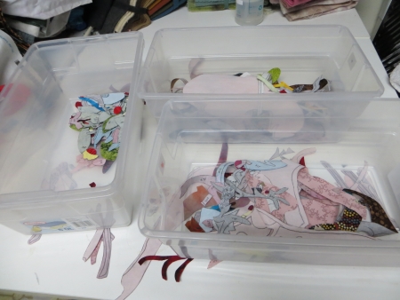 While the pieces are laid out, I have to protect them from a cat lying on them, so I use the bins with sorted pieces to cover up all the other pieces…