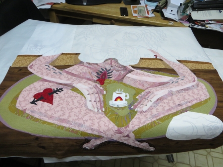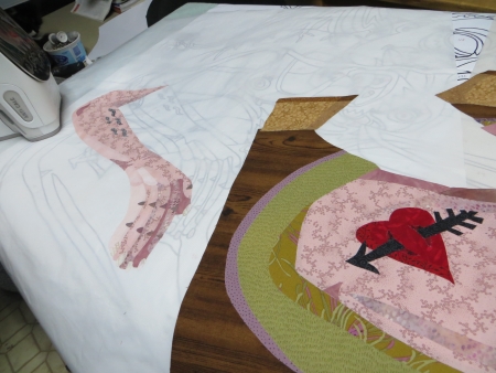Not really. She threw up on the Wonder Under and she leaves dirt everywhere…need to change her flea meds. I did clean up the light table, though, figuring I won’t be tracing Wonder Under for a while…need to finish these two quilts before the next one is due. Deadlines first, I guess…although there are two or three drawings from the last three months that are clamoring to be quilts. We’ll see…after December, when I get these two done.