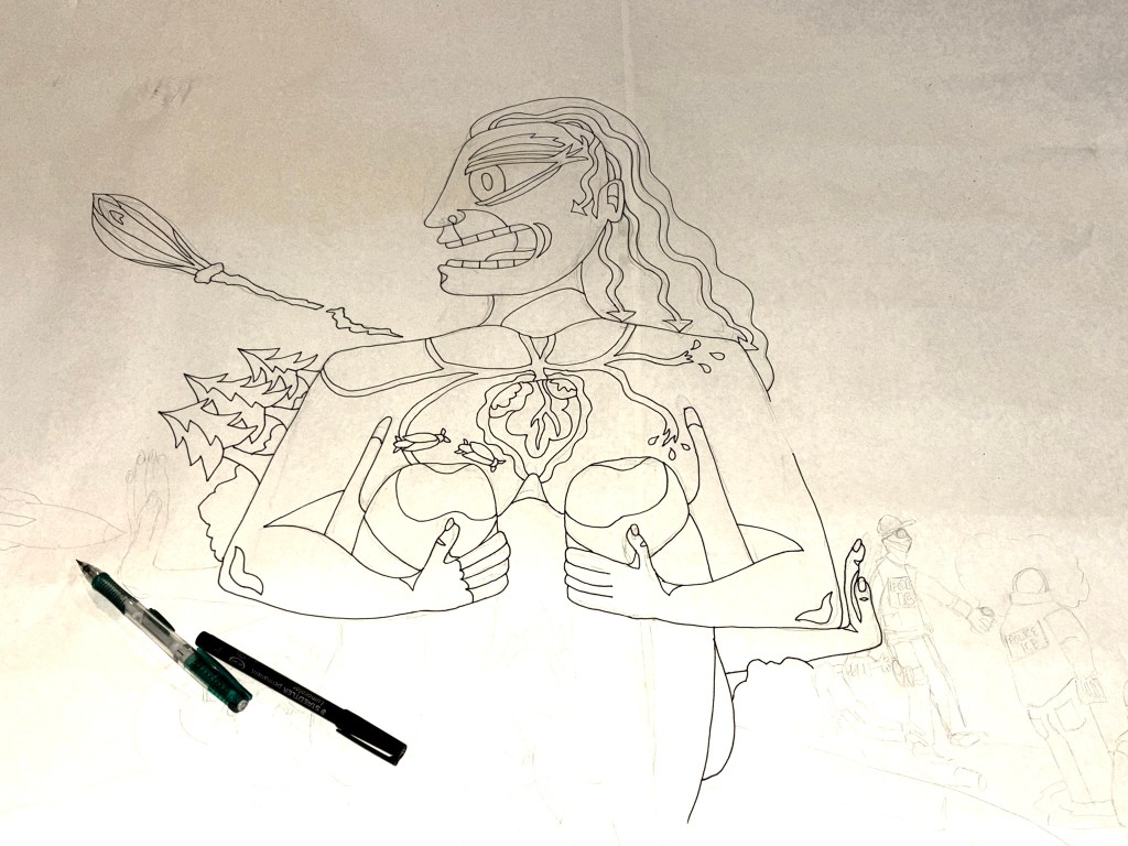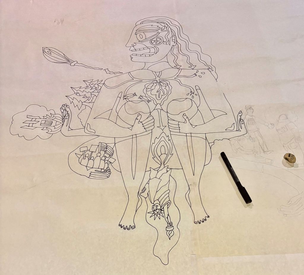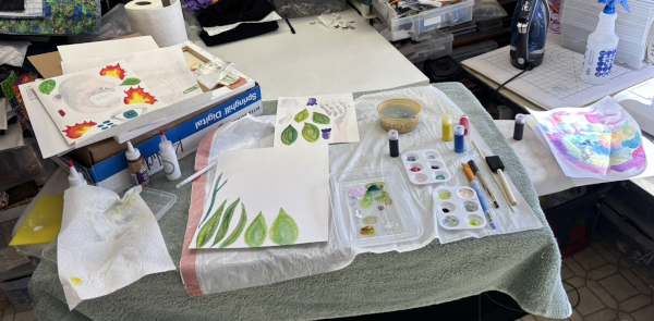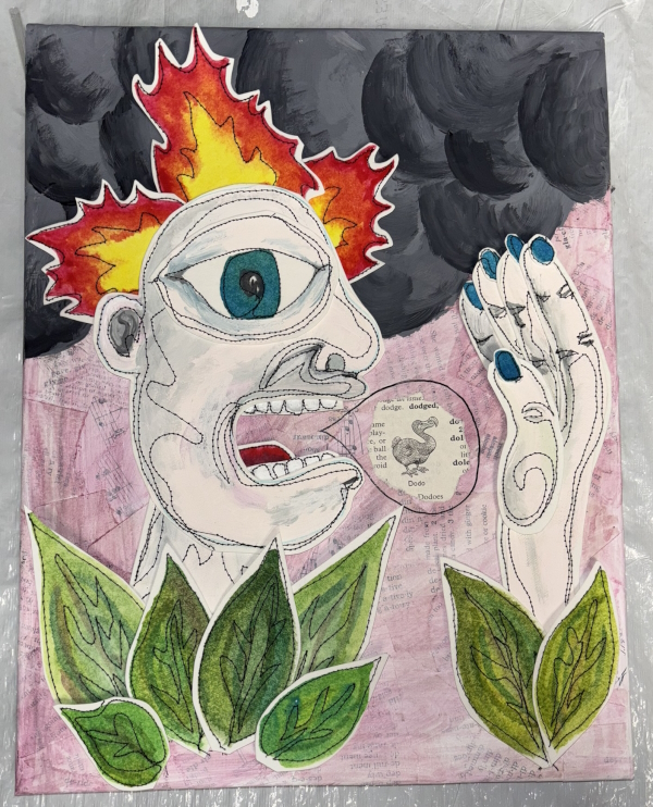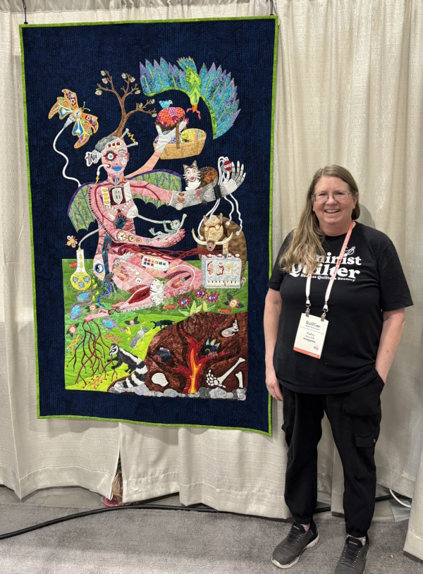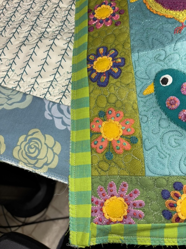 I haven’t been able to draw anything the last couple of nights…mostly getting dinner late and then it’s 10:30 and then it’s midnight, and I don’t even know what happened (see note about braindead). I did put the bindings on Sue Spargo’s Chirp quilt.