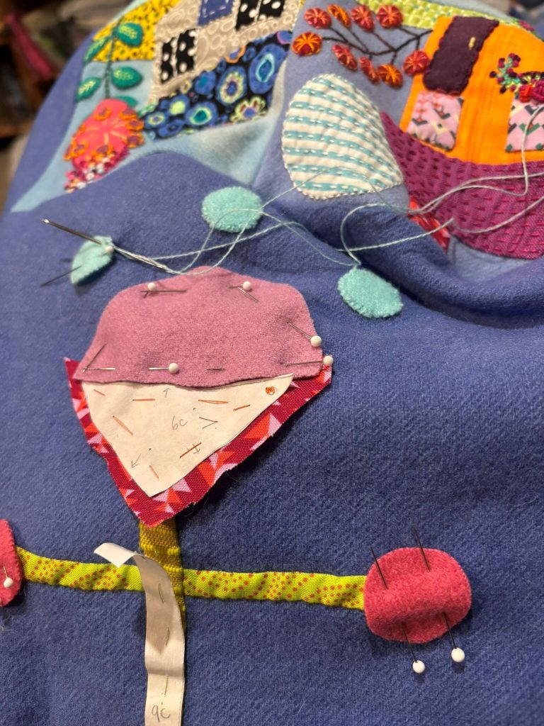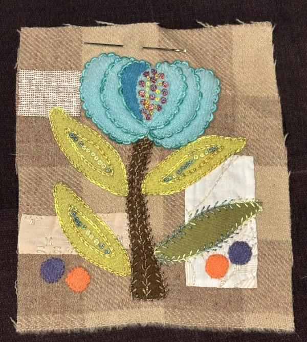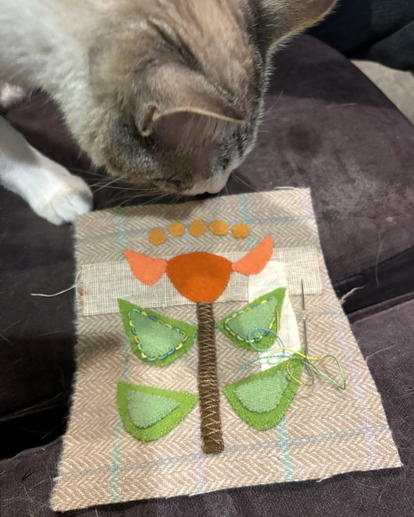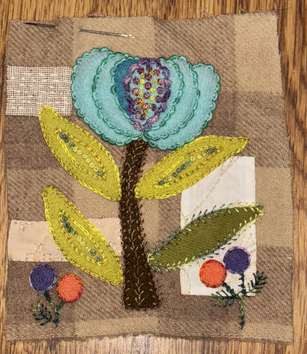 This is a complicated block. Part of Rooted. Fun trees. It’s very portable, unlike Homegrown, which is the whole quilt at the moment. Sewing wool in summer is not ideal. But it works for braindead…and school board meetings.