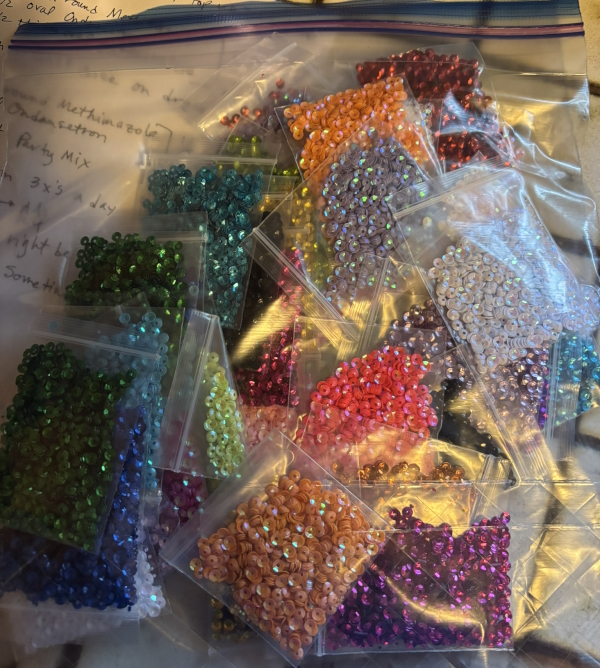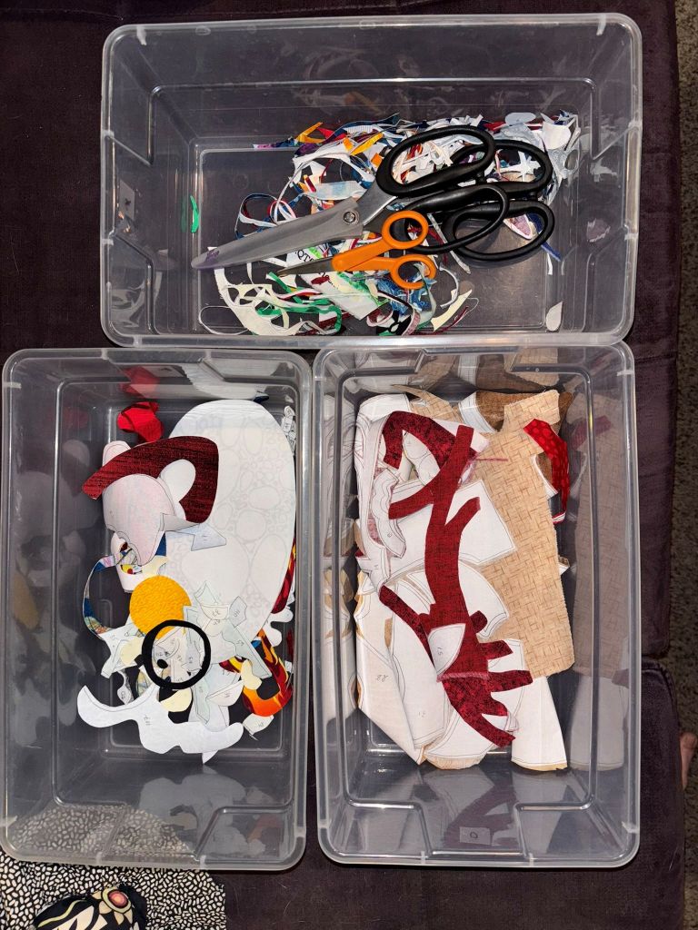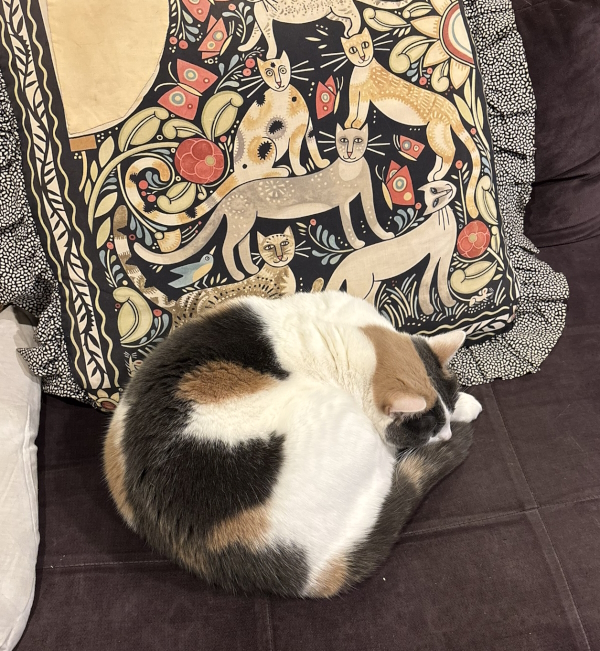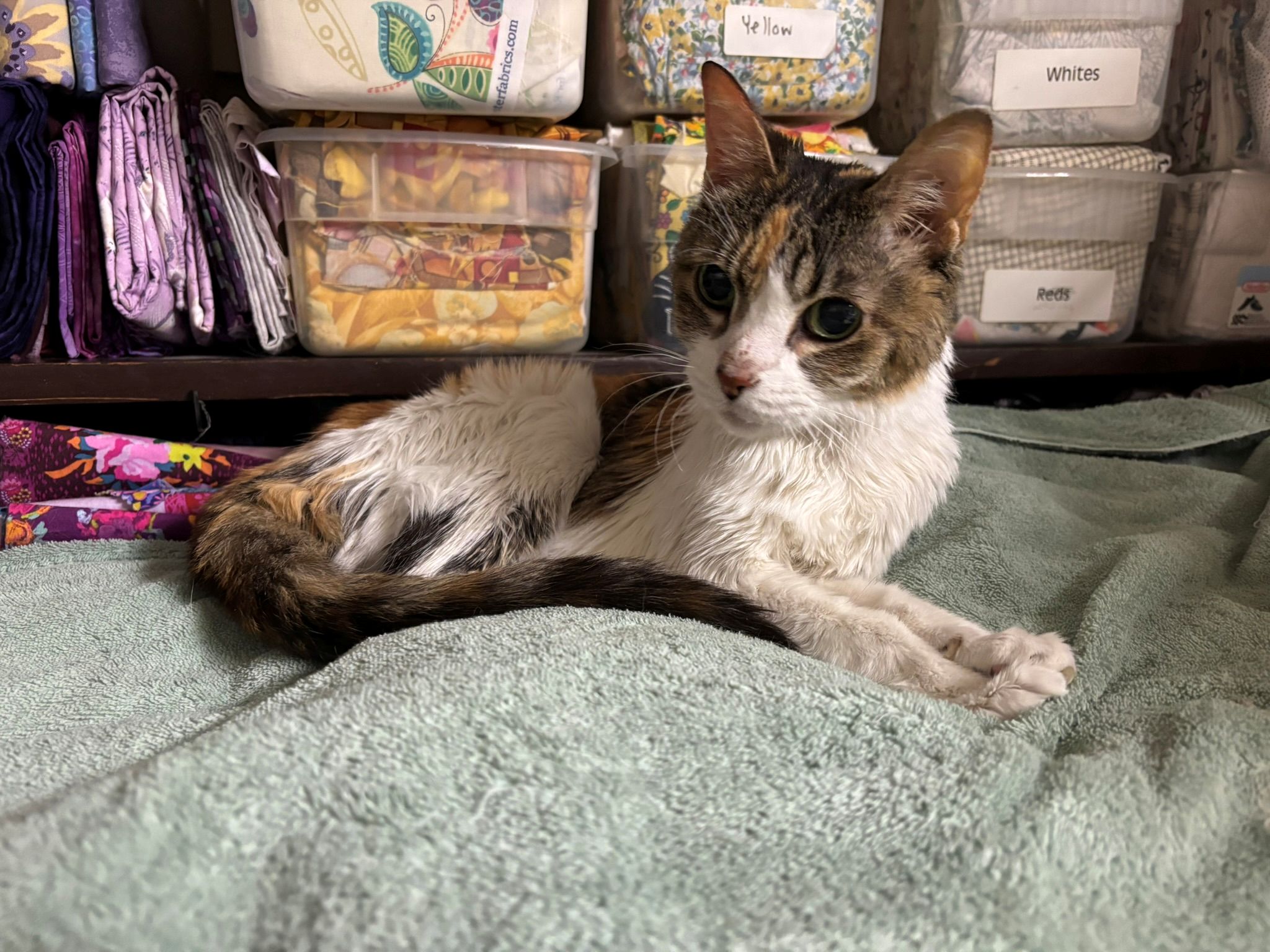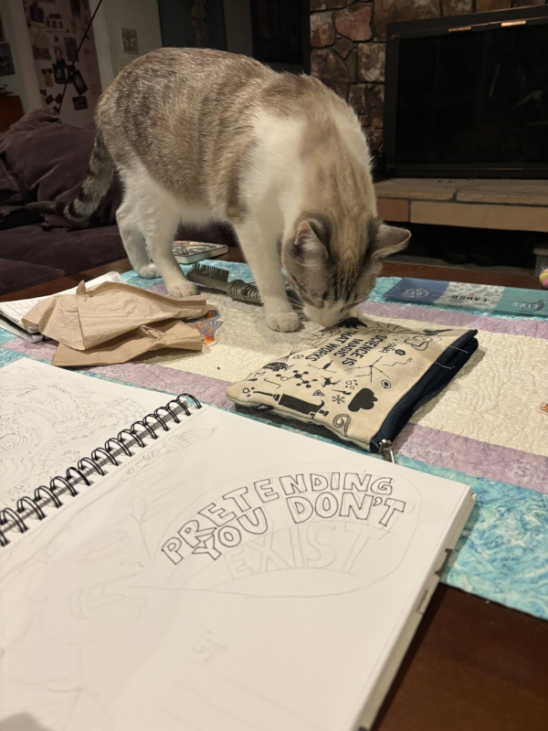 And sleeves. I found some fabric that had been in a plastic bin on the desk I use as a sewing table since the girlchild was in high school…it’s faded in a few spots, and it had a bunch of cat hair embedded in it, from when Midnight lived on it…or Babygirl? Not sure which cat lived in that box. But I washed it and the other stuff in there, recycled bits, stashed the rest. Got rid of the damn bin! There’s a lot of stuff in the sewing room/office/studio (it gets called all those things) that I literally do not know with what to do. Random shapes of cutting rulers. I don’t piece. I really only need the two I use all the time. I tossed some stuff. I had gone shopping for thread, now that Joann is gone (the store, not some woman), and I found three large spools of thread I can use in the bobbin for the next three years, if I can figure out how to set up the stand for them. Mooommmm!