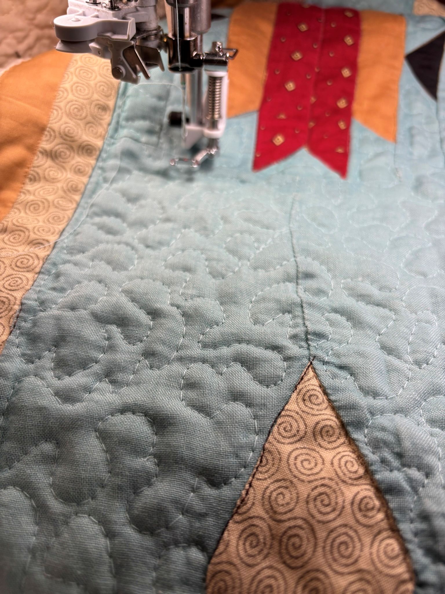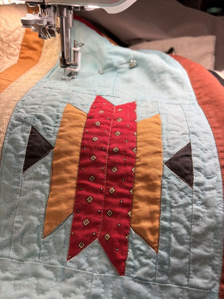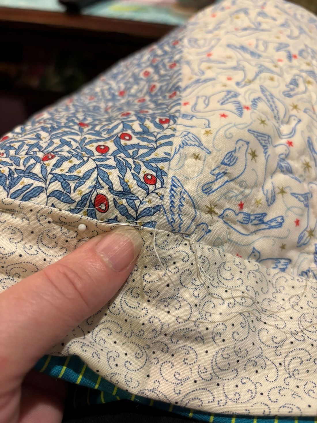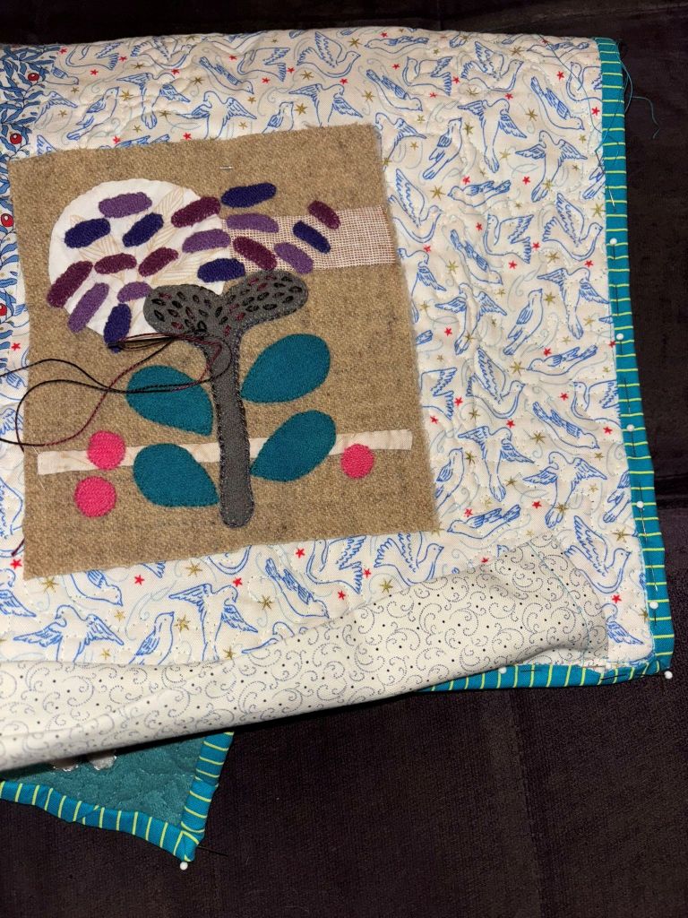 So I need to do all the handsewing of the binding. I got about halfway through it last night. This is not a large quilt. I do have one more wool quilt that needs quilting. It’s bigger and way more complicated. I’m not there yet.