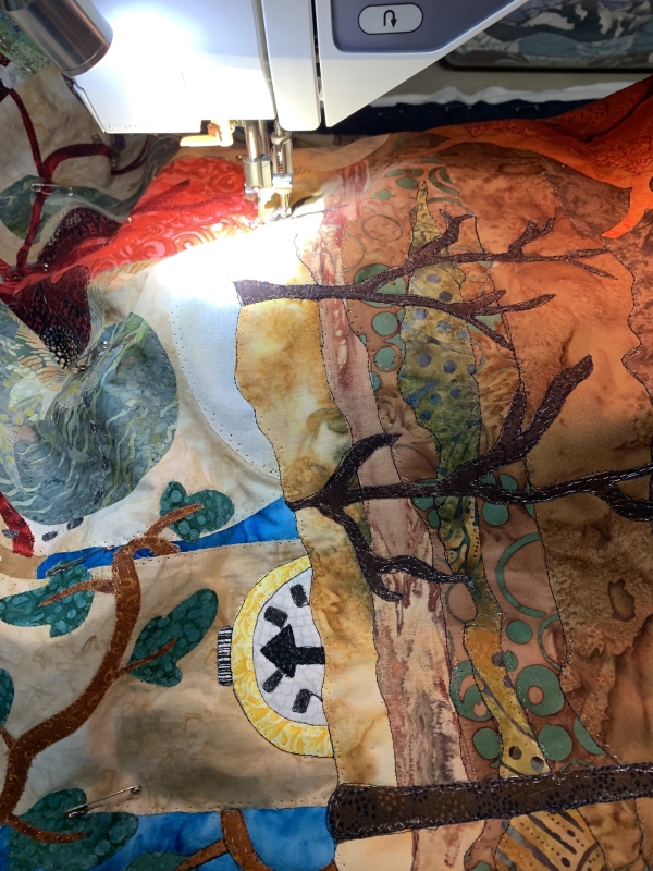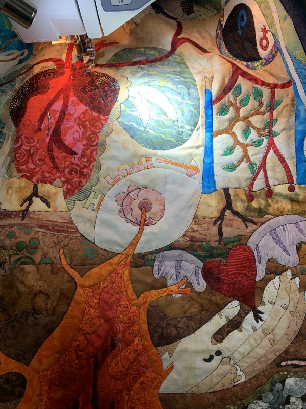 Almost 6 hours. Did you know that not last week, but the week before, I did 20 hours of artmaking? While working? I think that was the week I was sick too. My weeks have been nuts. But she’s quilted. Tonight I can get the binding on. I might even finish early. I have to deliver two to the photographer. I should email him. I said I would. OK, done. Emailed.