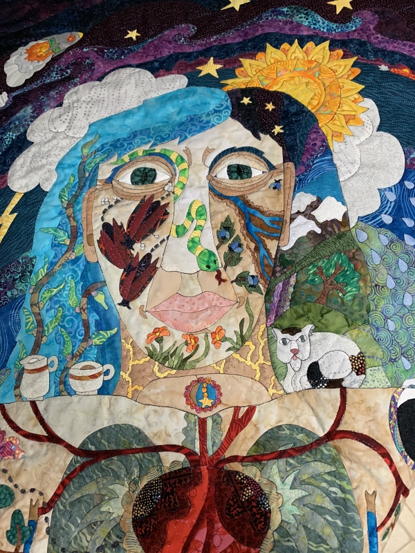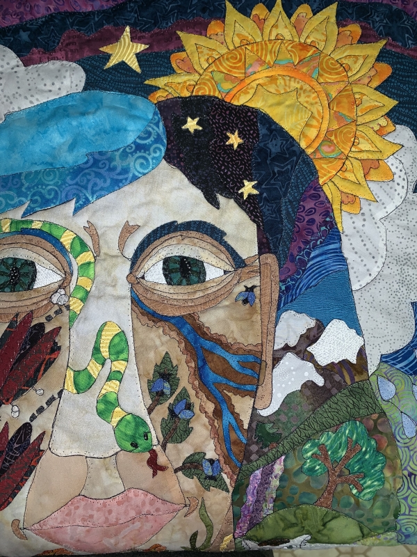 Well good morning all! It is the last day before Spring Break, hallelujah, and I am ready for it! Nope. I’m not. Not at all. I did work my butt off yesterday and created all the posts we need for the project when we come back from break. And realized I hadn’t copied one thing that we needed. Oops. Fuck me. Then I delivered my quilts to the photographer, so I should have those back in the next few days. Deadline met! Then I headed out to San Diego Mesa College for the opening of Subterranean…here’s me and Grace Gray-Adams with our respective pieces.