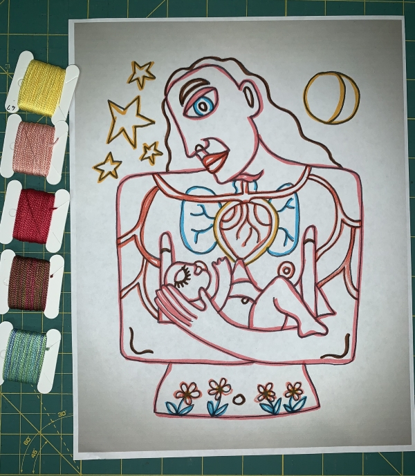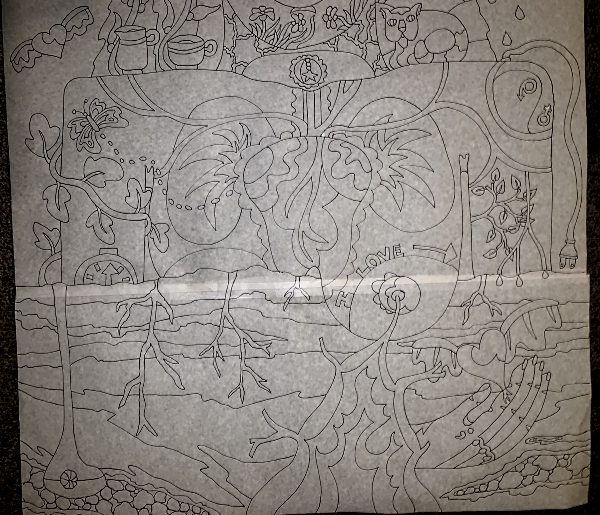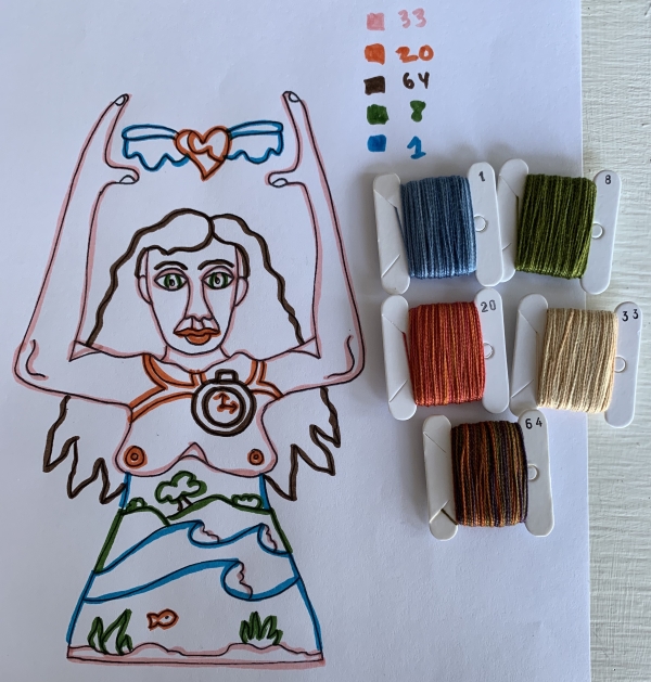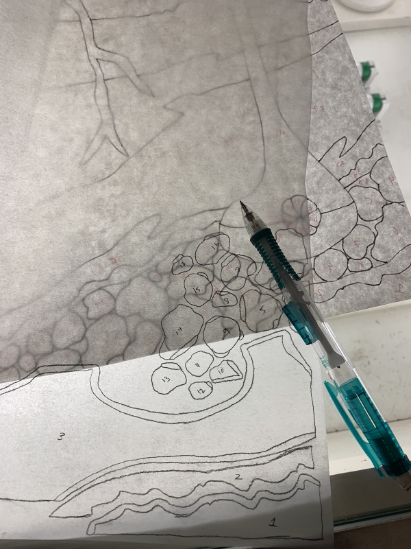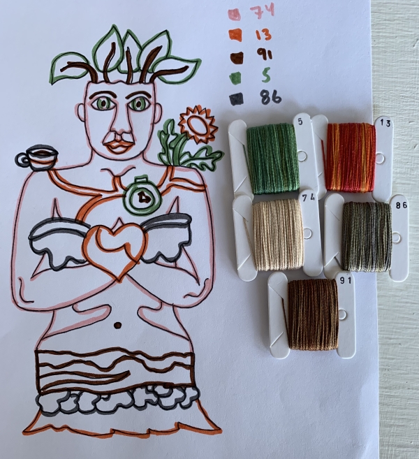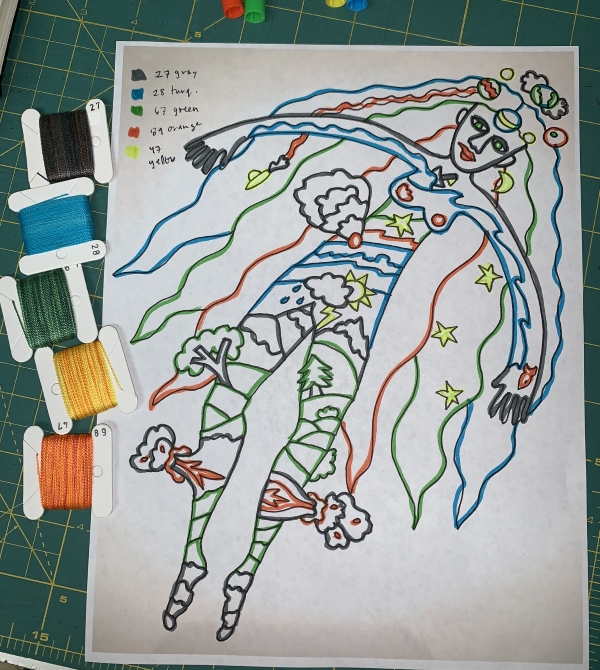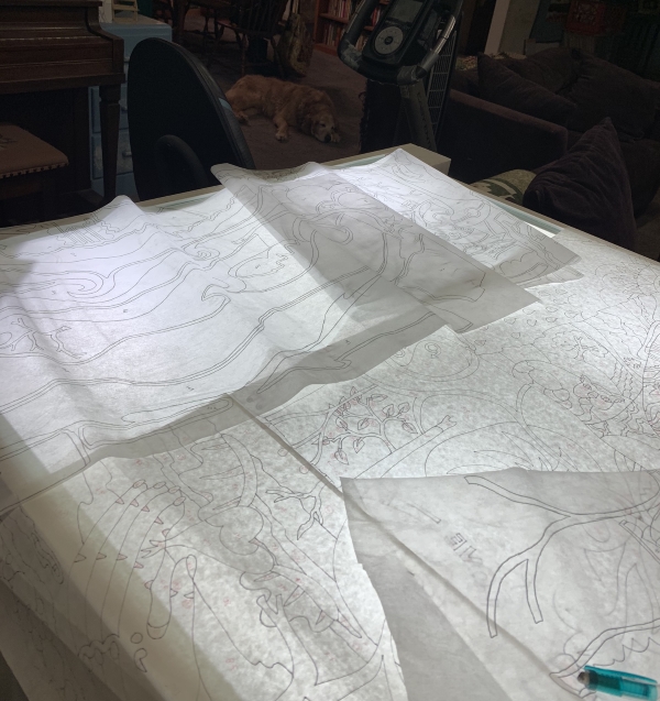 And I ironed a piece of the stem to the wrong fabric, so I redid it. This was somewhere close to midnight. I said I rallied. This was when I got tired. I had done part of an arm before and realized the head needed to go behind it, so it would make sense to skip ahead in the numbers, pull from the 500s and then the 400s, leaving the 300s behind for now.