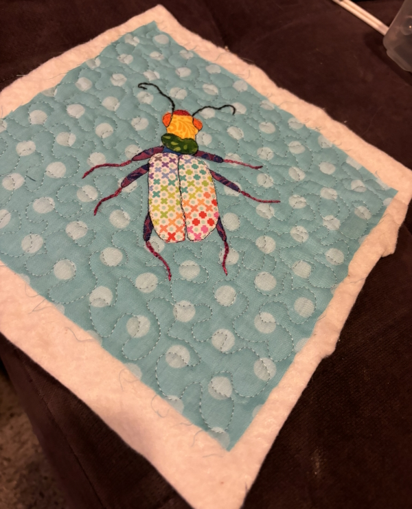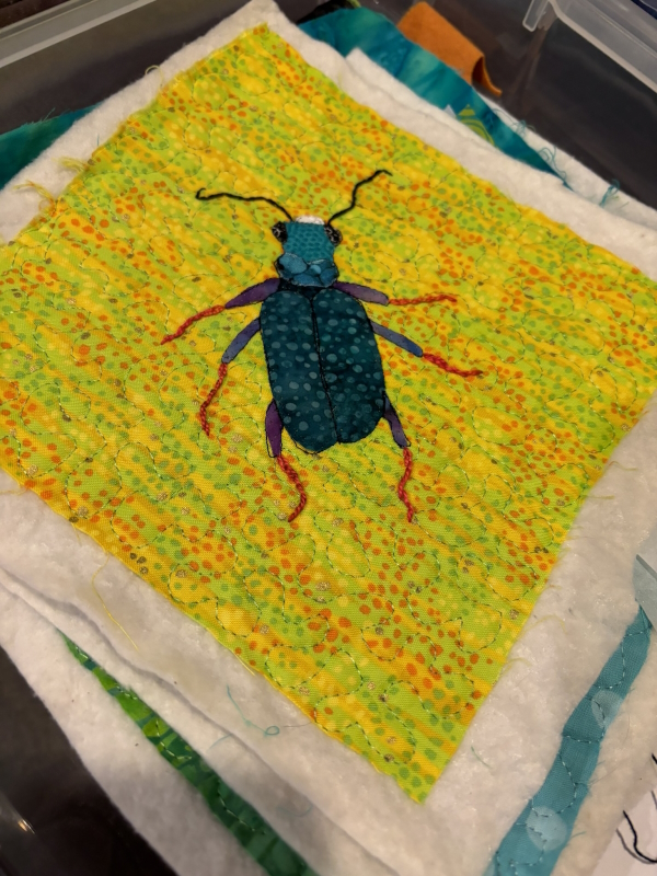 No, it’s not done. There’s 16 big embellished flowers for the borders. Bowie thinks he might climb it. This is Sue Spargo’s Homegrown, a block of the month I started in March 2020. No joke. Last night, I pinned some things down to it, also with Bowie interest.