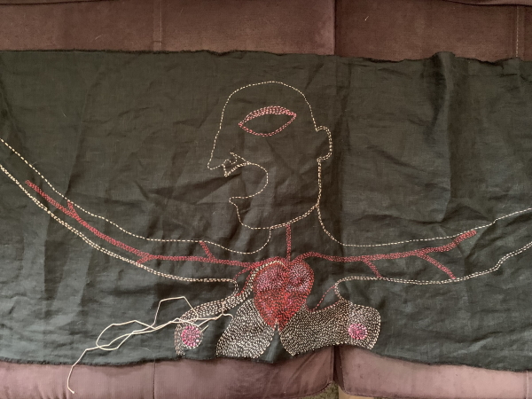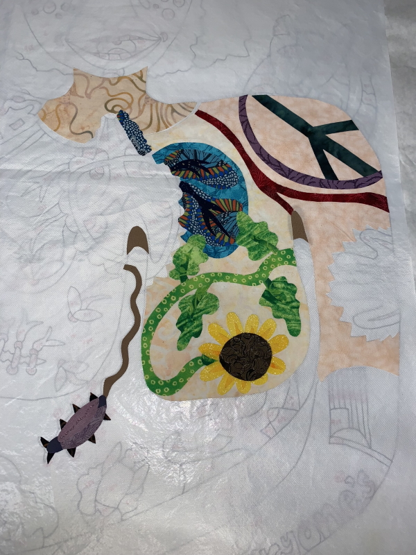 Last night, I started into the flesh of the large figure and also one of the big heads in the quilt.