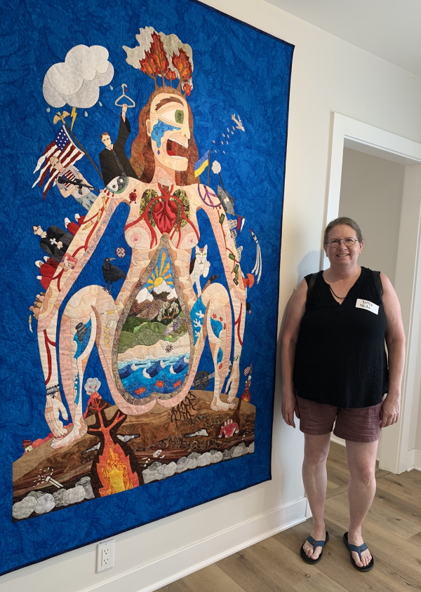 Although I took these two days off for the SAQA thing…yesterday we got to listen to a bunch of inspiring artists talk about their practices: Jane Dunnewold, Paula Kovarik, Betty Busby. Best quote: “When you know what you’re about, no one can take that away from you” (JD). Paula made me want to use more, play more, cut things up more. Betty is just amusing and inspiring as hell. I’m spending the next two days in a workshop with her. Looking forward to it. I got to see lots of other people I hadn’t seen in years, since 2019 or 2015 or whatever. Yes, I also got a new student at school, had to add them to my online class, then to the app they were using in class, and then they pulled my sub, the one that has access to everything, fuckers, seriously, if I set up a specific sub that I trust while I’m gone, then you shouldn’t fuck with that. That shit pisses me off. So who knows. I did set stuff up so hopefully anyone can handle it, but you know how that goes.