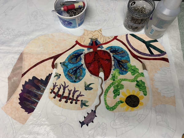 Did the lower torso that is above the arm…then realized the whole damn thing was too heavy to keep on the ironing board, so pulled another Teflon sheet and started the upper torso on that.