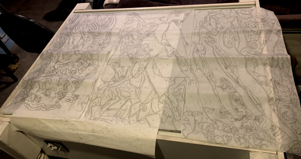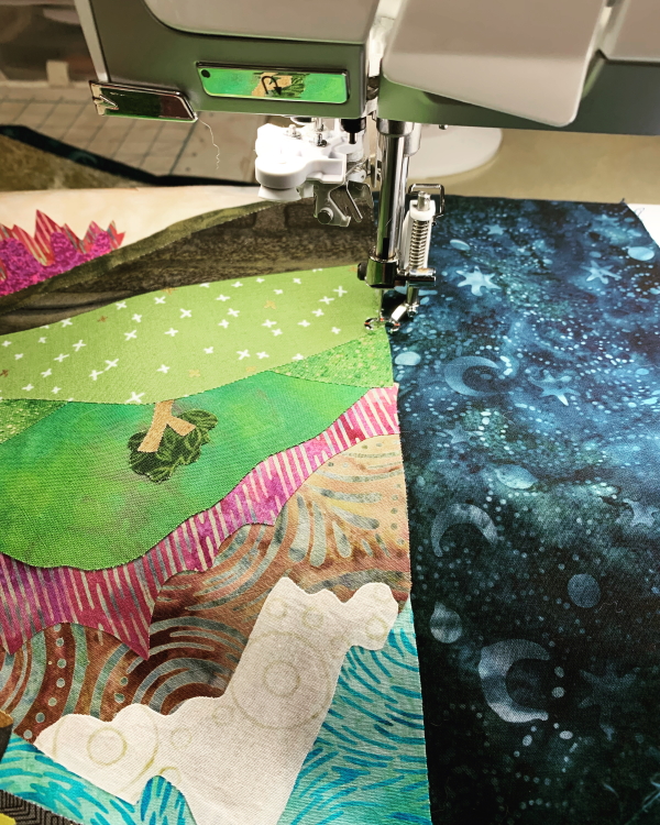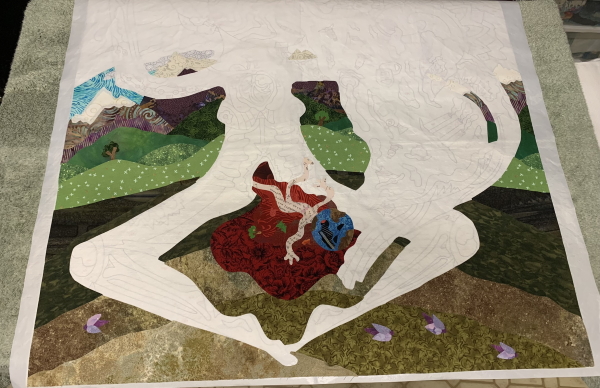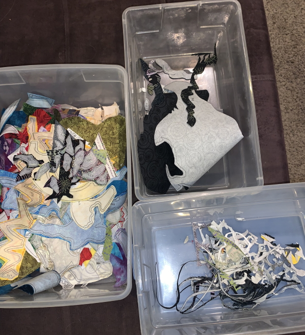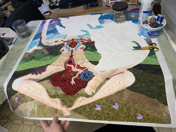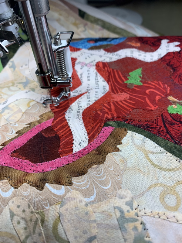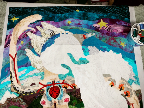 I’m probably a little less than halfway? I think. I’m hoping to do some this evening. The Man has a show tonight, which I am going to, but it starts later, and I have to clean up my classroom a little and then go to Home Depot for slats, then pack up two quilts to deliver tomorrow morning, and THEN I could stitch for a while before going to see the band. OR I might nap. If I can. Which I often can’t. So there’s that. But assume stitchdown is done tomorrow and then sandwich and pinbaste, so I’m quilting by Sunday. Sounds good. You can see how I assumed I could be done by Thursday. Let’s ignore the fact that I need to wrap all the presents, buy a few more, clean the girlchild’s bedroom because she’s coming home Sunday night at 10:30 or so at night, and probably do some schoolwork as well. Yeah. Ignore that shit. Just do the art.