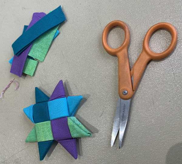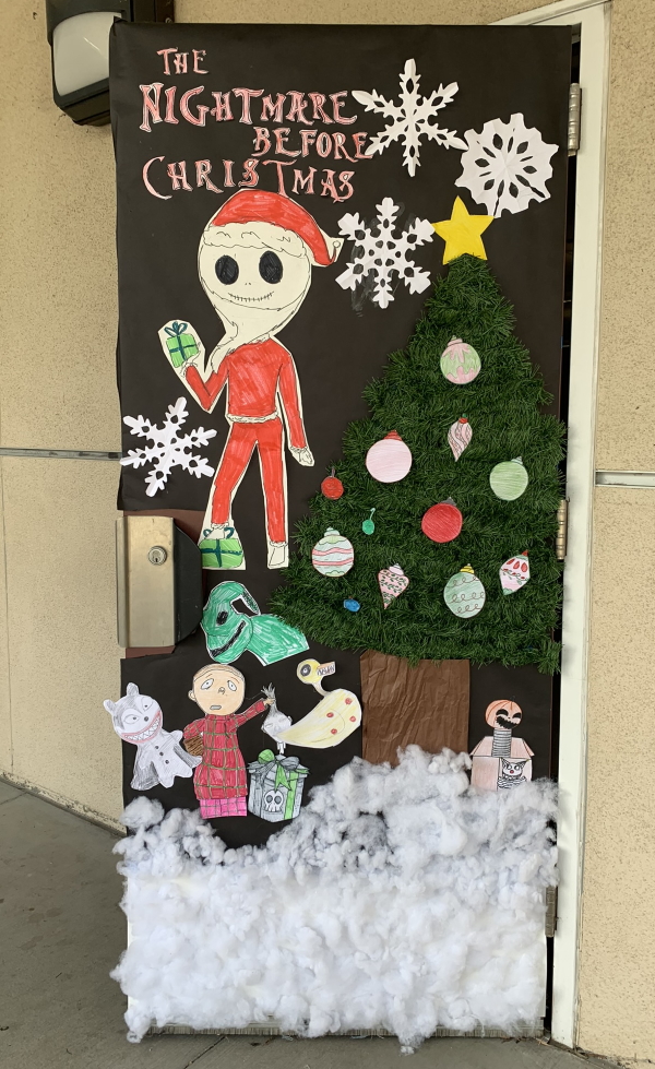 They did pretty well. I glued the title on for them. I also traced the title for them, but they did the rest. I brought stuffing and the garland and a glue gun too. I didn’t even know about the ornaments…they surprised me. They’re good kids. You know what one of the things I have to do before I leave is? Take all that off the door. Uh huh. I know. Well it was up for less than 48 hours. What can I do?