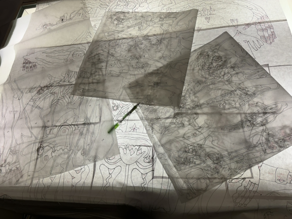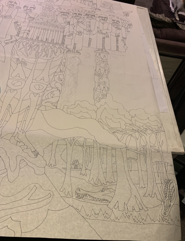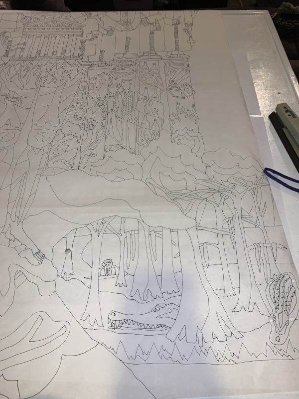 I did not go to bed right away, though, because that would make too much sense. I taped more of the drawing together and added paper to the top and bottom for more drawing.